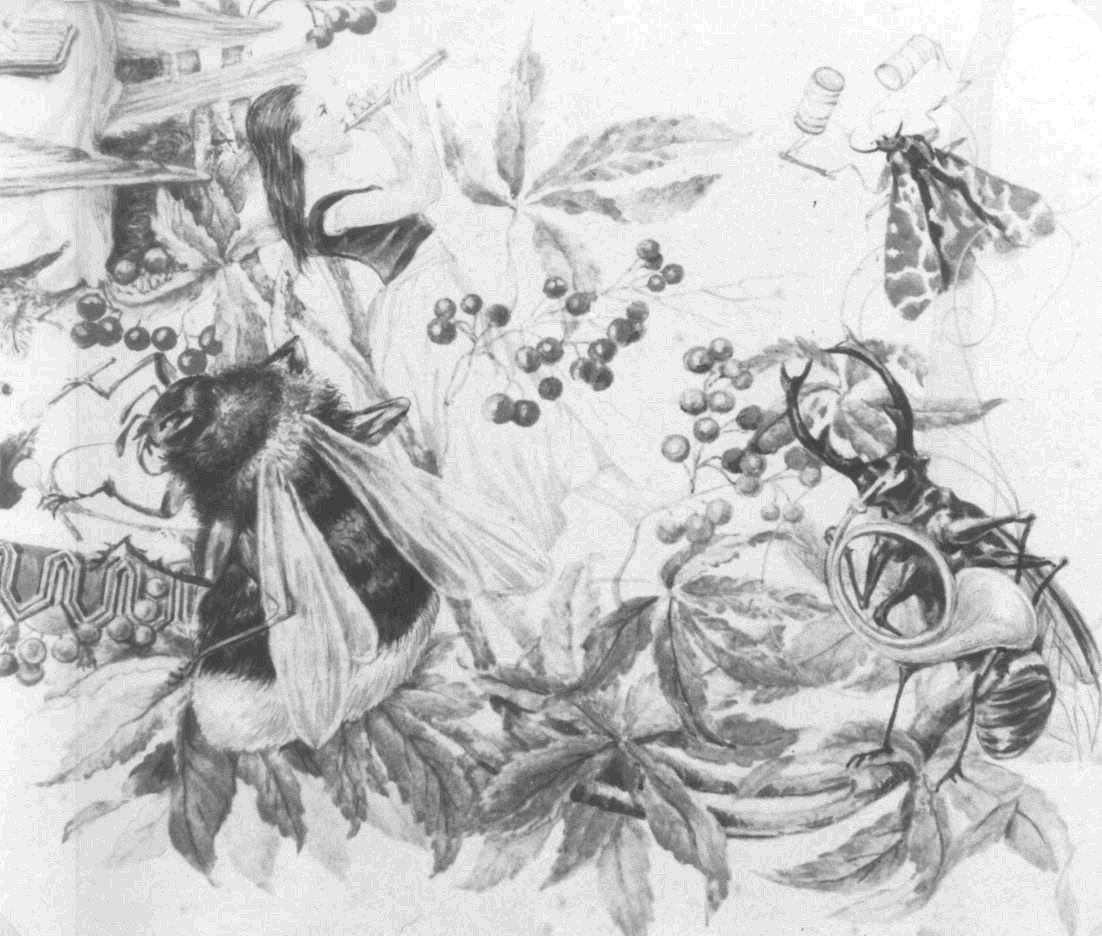 Nach diesem Abstecher in die Große Sandgasse, wieder zurück nach Rödelheim. Hierher gehört ein Brief von Armgart von Flemming, der 2. Tochter Bettinas. Er wird im Geburtsjahr meines Vater 1876 geschrieben sein. Nebenstehend nur ein Ausschnitt der genannten Zeichnung. Armgart hat es wirklich schon immer mit den Insekten, Käfern, Schmetterlingen gehabt. Auf dem Huldigungsbild, welches sie für den König von Preußen gemalt hatte, wurden die Regimenter der Garde-Infanterie und –Kavallerie als Schmetterlinge und Käfer dargestellt, natürlich in den entsprechenden Regimentsfarben. An Phantasie hat es diesem Mitglied aus der Brentanoschen Familie jedenfalls nicht gefehlt.