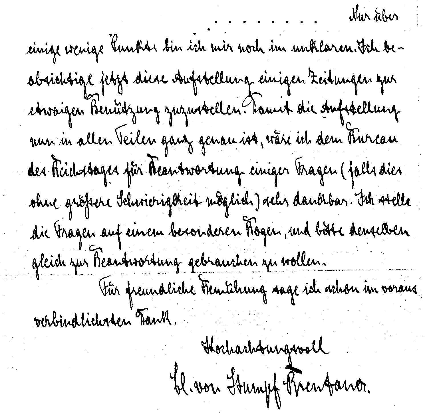26. Januar 1910 An das Bureau des Reichstages. Ich weiß nicht, ob es private Initiative von ihm war oder ein Auftrag. Jedenfalls hat diese Arbeit ihn lange beschäftigt. |